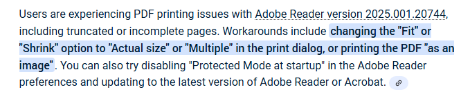 Some users may be seeing printing issues when printing PDFs from a certain version of Adobe Reader. This has been reported recently (9/30/2025) If you are seeing this, please following the workaround(s) provided below until Adobe has this issue resolved...