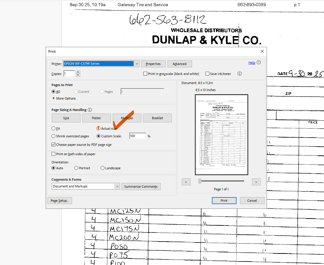 Workaround 1... Select 'Actual Size' as shown below. If this does not resolve the printing issue, try #2.